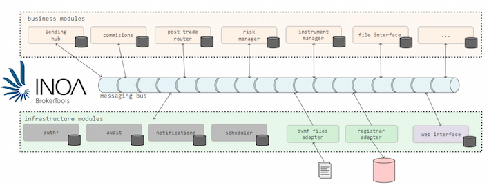 O BrokerTools é composto por módulos independentes de propósito específico, de forma a permitir maior especialização de tecnologias e das equipes responsáveis por cada sub-sistema. Cada um incorpora à solução uma gama de funcionalidades. Algumas interfaceiam com os usuários, outras processam as regras de negócio de cada área do business, outras cuidam da infra-estrutura e outras são responsáveis pelas integrações com sistemas externos.